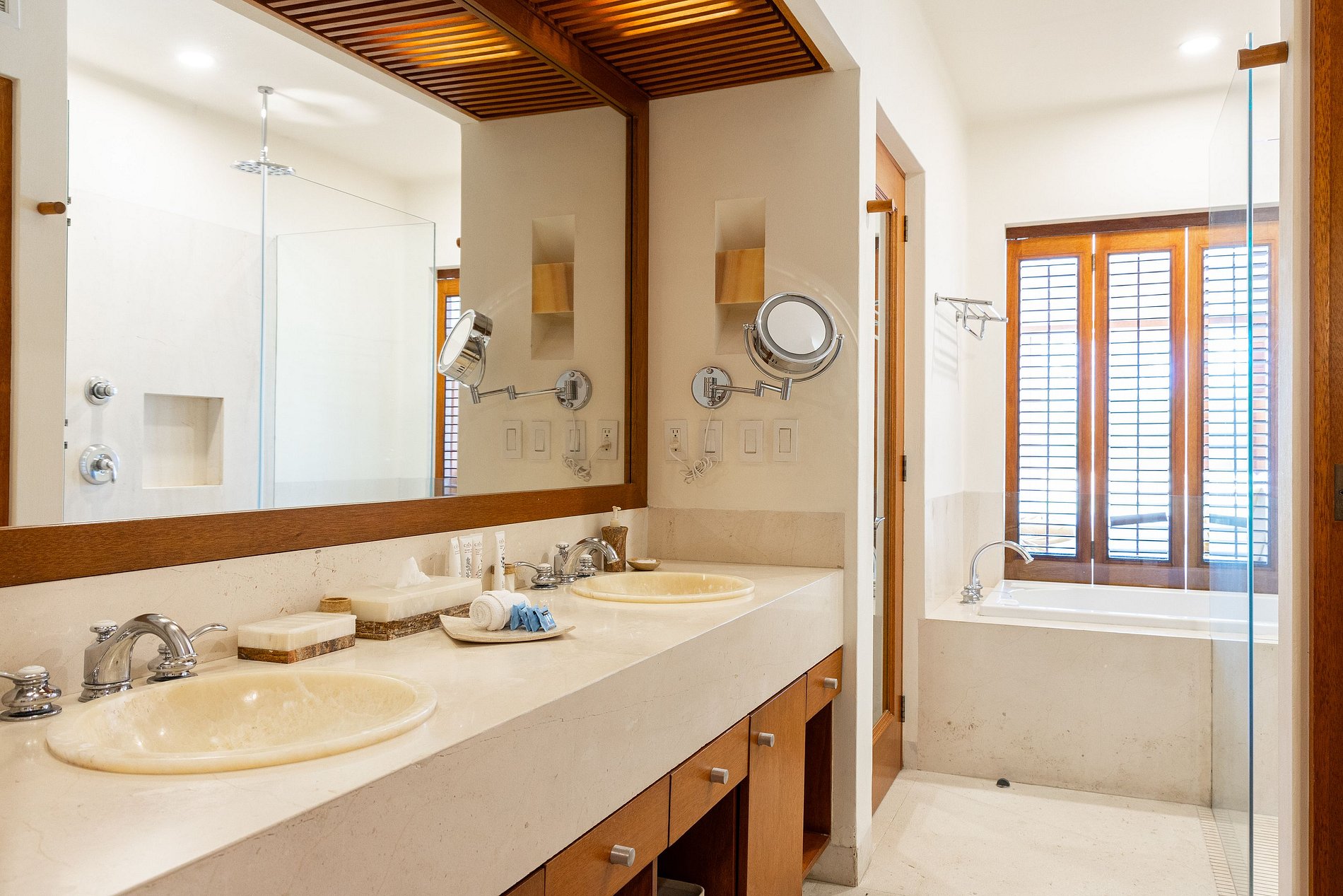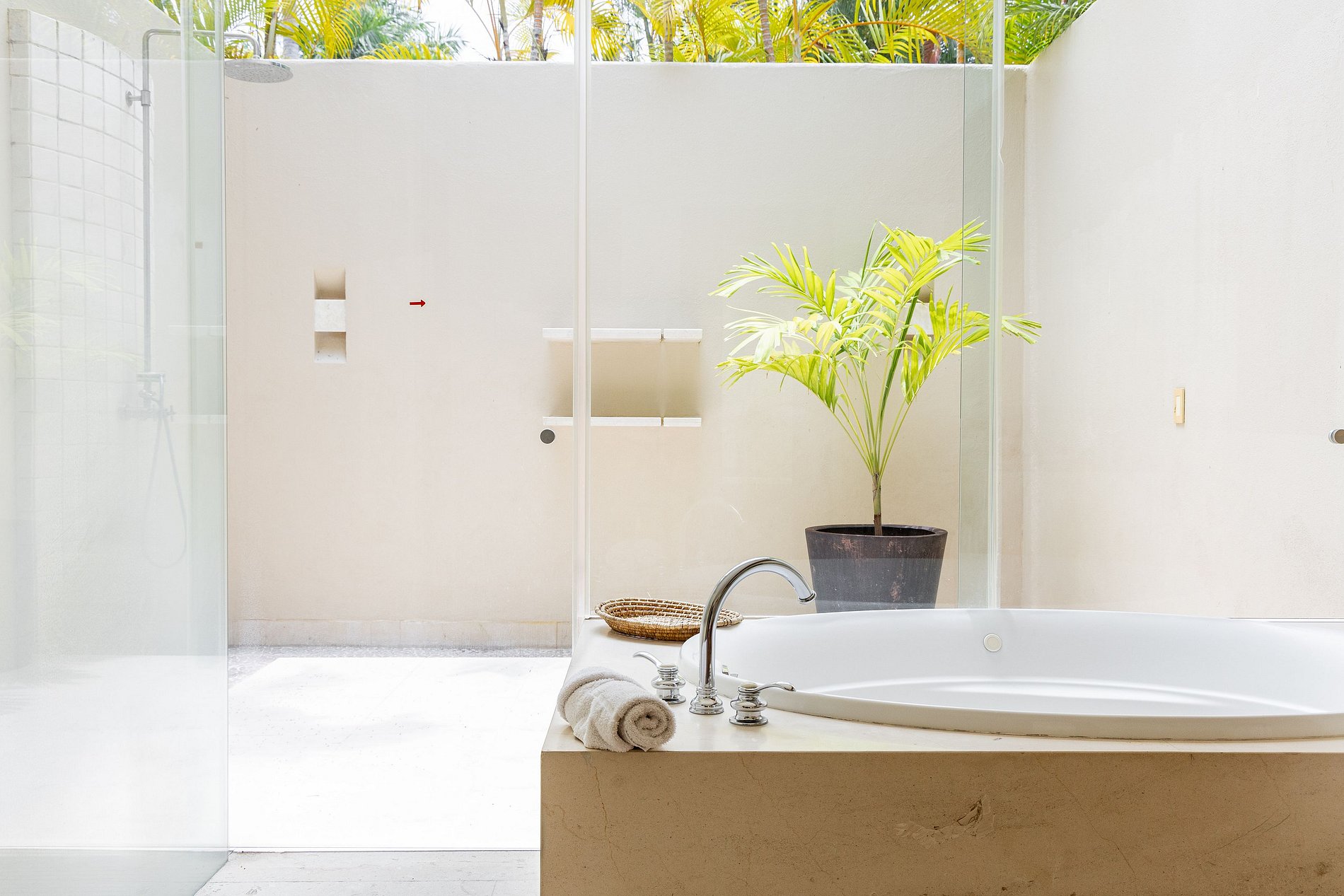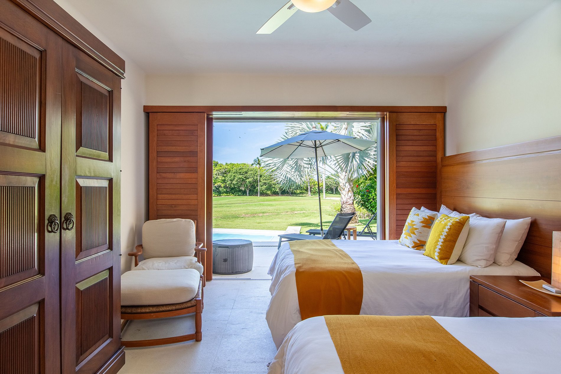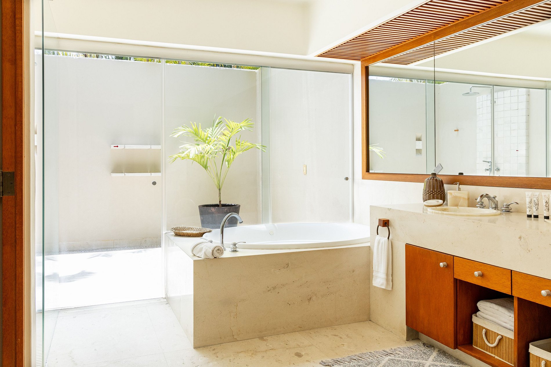 The bedrooms are spacious and each has a full bathroom, two of them with a bathtub and outdoor shower.